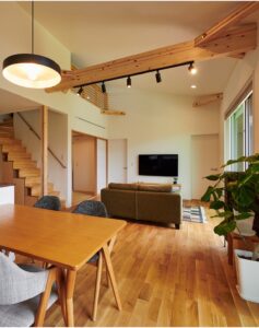 天井が斜めに高くなっているデザインのことです。通常の天井よりも高さが出るので、空間が広く見え、家全体が明るく開放的になります。