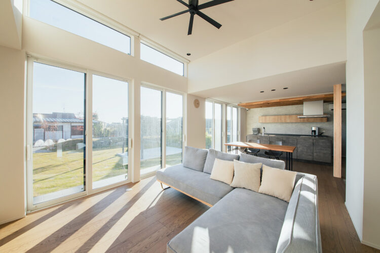 大きな窓から光がたっぷり入り、どの時間も心地よく過ごせるリビング