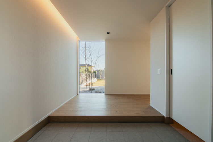 玄関に入ると、正面の大きな窓からやわらかな光がすっと入り、明るく開放的な空気が広がります。