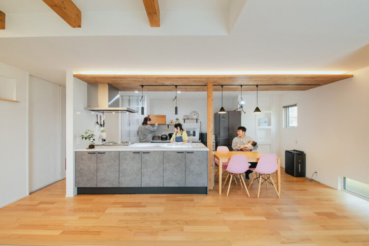 キッチンからダイニング、リビングまでが一直線につながっているため、料理をしながらでも家族の様子が見えやすくなります。