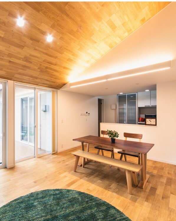 天井を高くすることで視線が上に抜け、実際の広さ以上のゆとりを感じられる空間になっています。