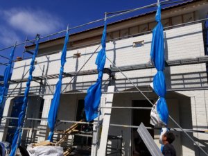 まず、いつもなら工事中広げている飛散防止用のネットですが、こちらは紐で結んで風を受けて倒れないようにまとめていきます。