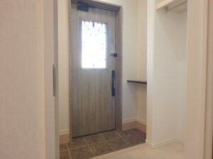 玄関ドアを明るい色にしてアクセントとしました(^^)/