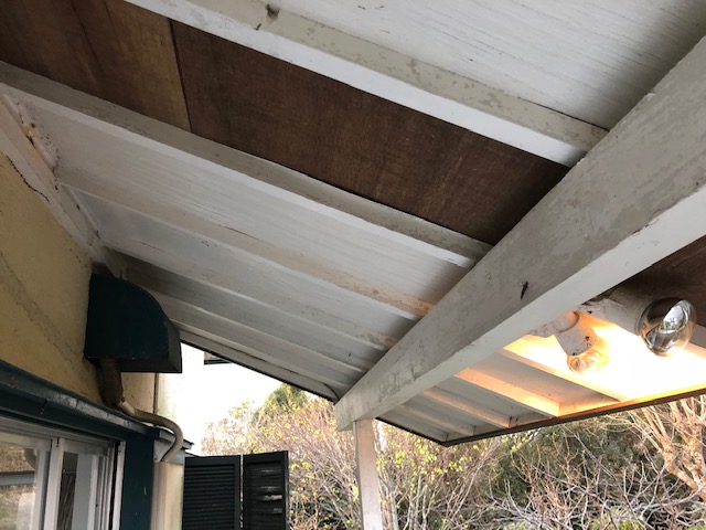 雨風で軒裏のべニア板が剥がれてしまってます。