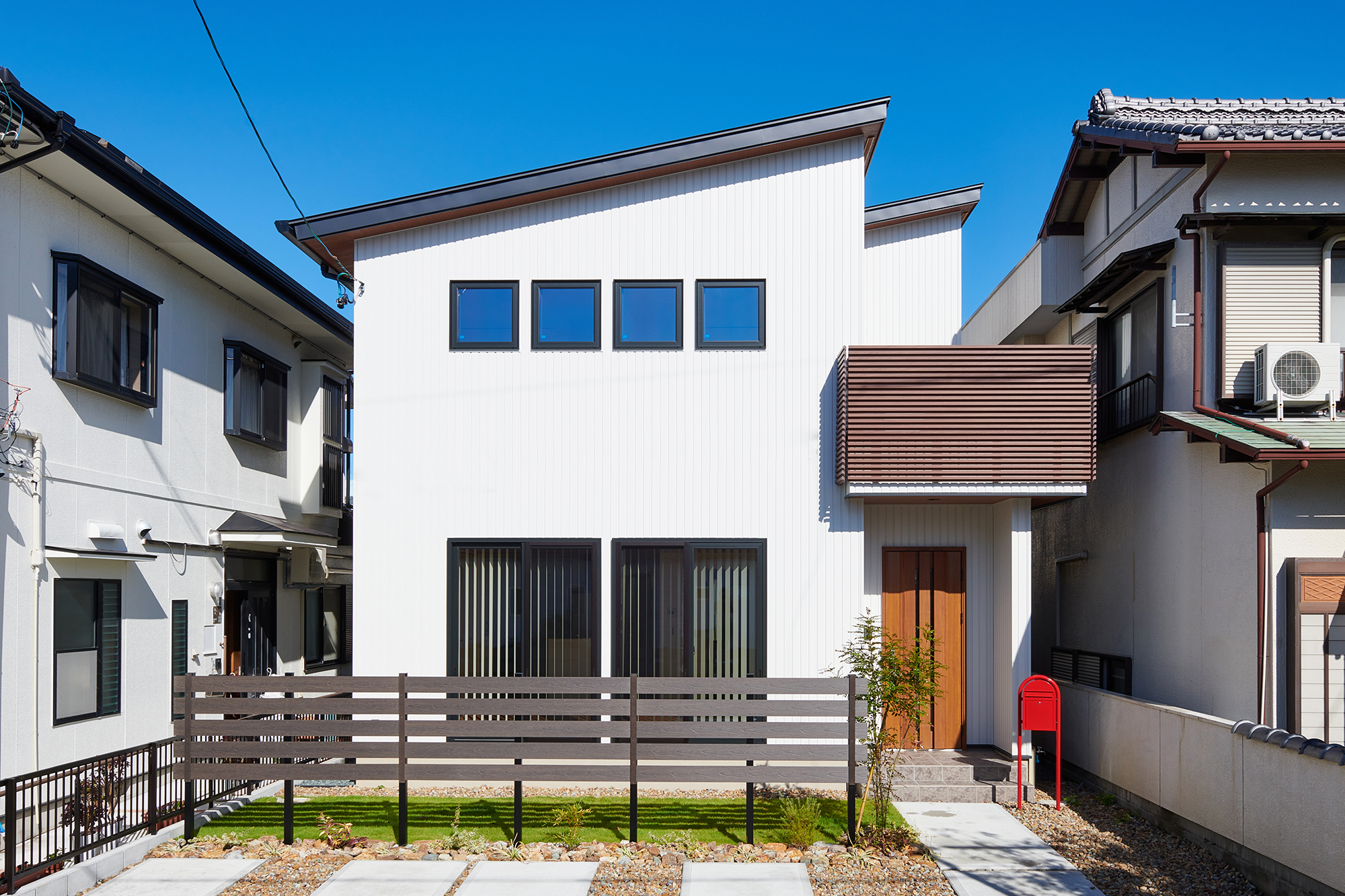 真っ白なスパンサイディングの外壁にバルコニー部分の木目がアクセントでおしゃれなデザインに仕上がっています。