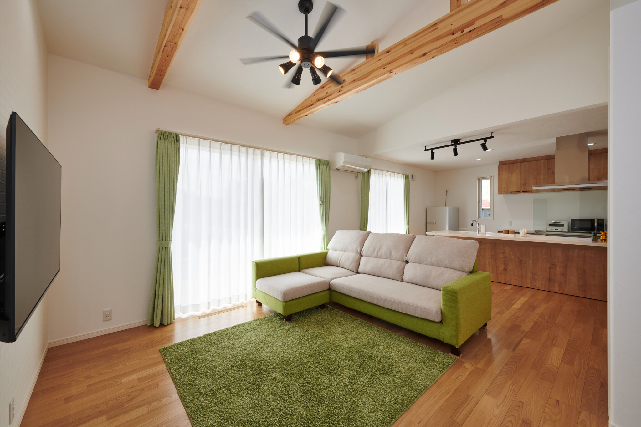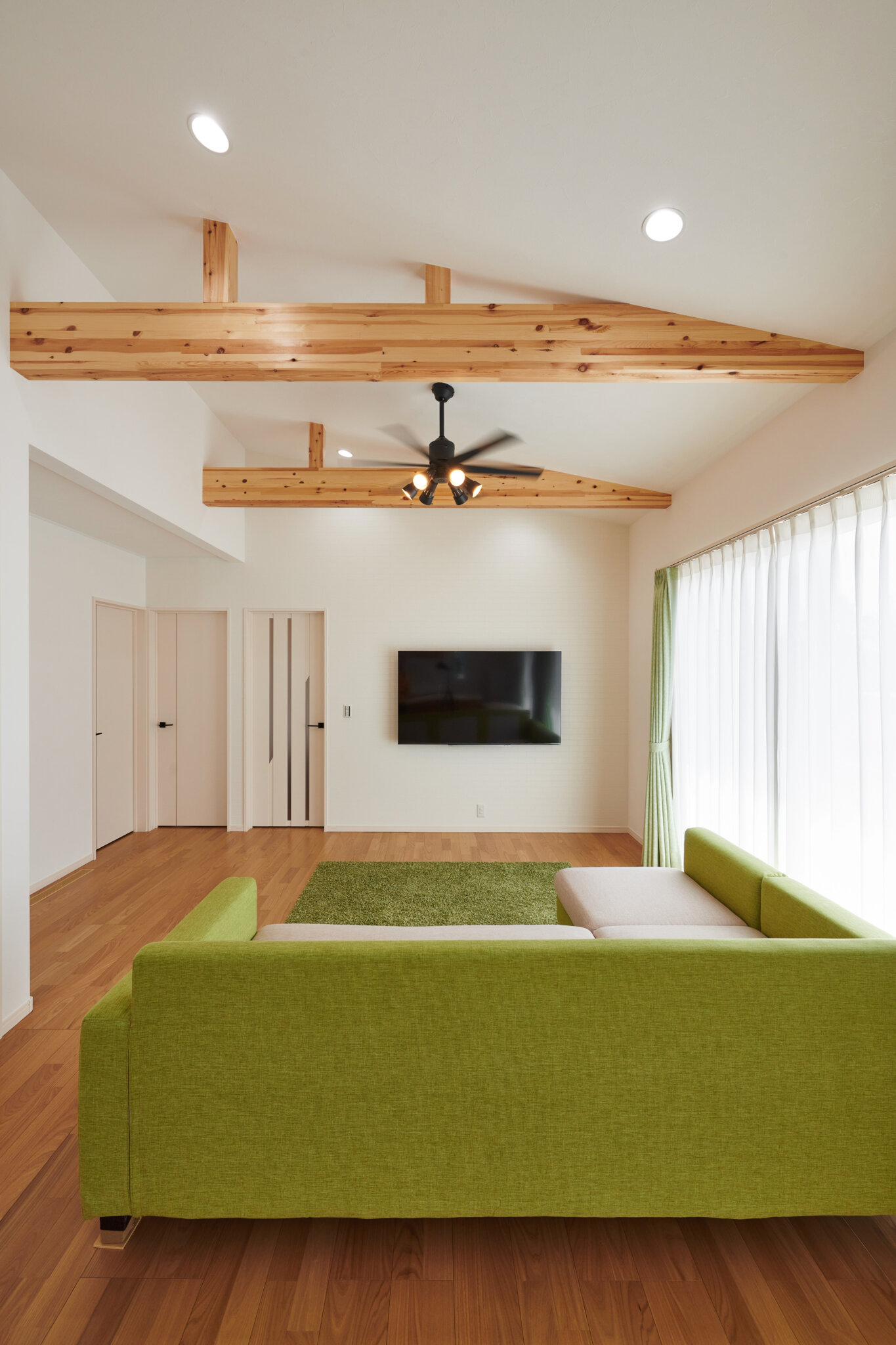 LDKからすべての居室に繋がる動線に加え、勾配天井にすることでリビングをより広く感じられる間取りに。