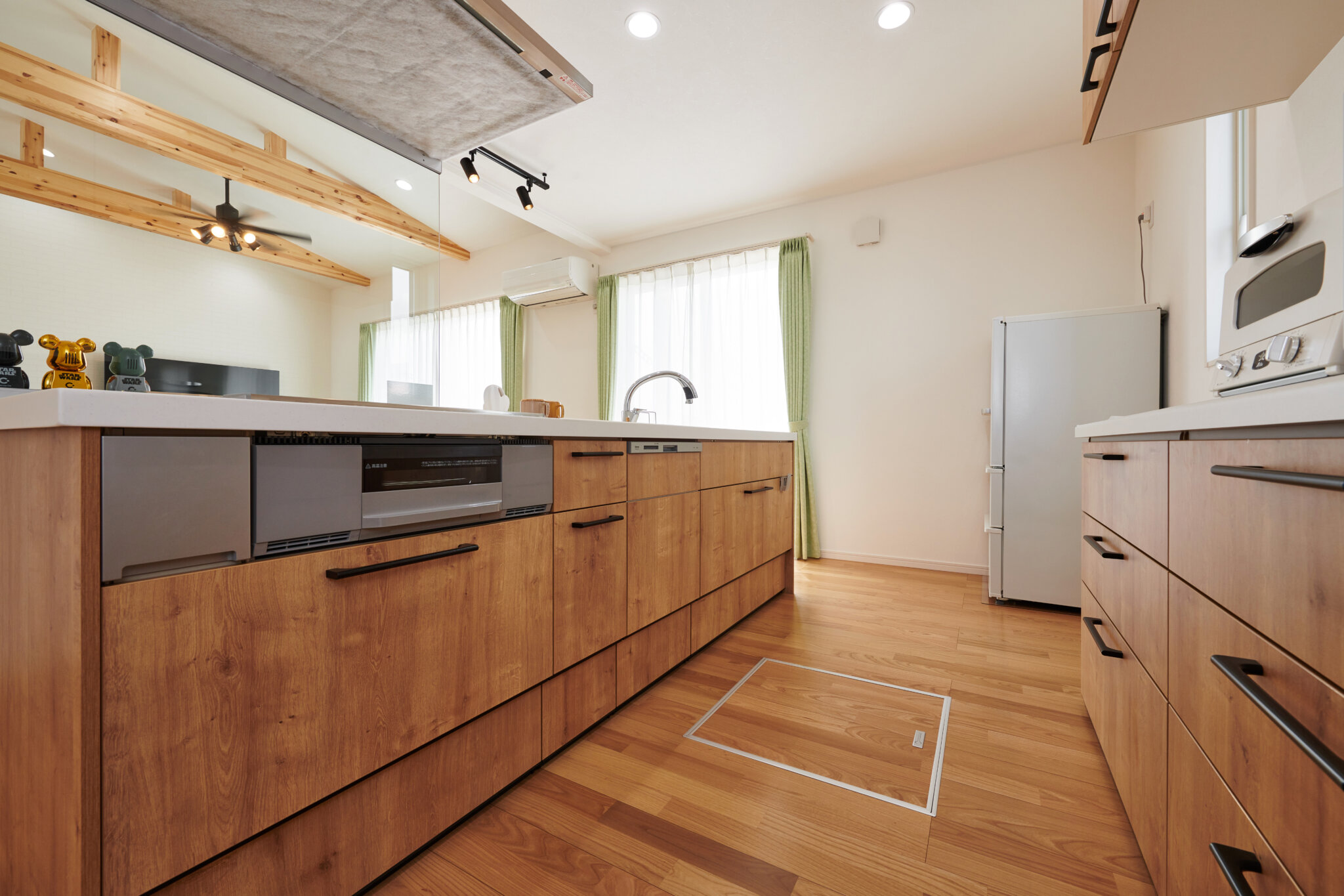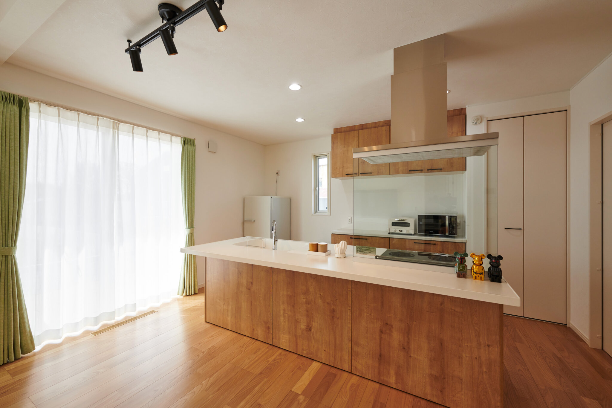 開放感のあるアイランドキッチン。家族全員で調理しても動線が重なり難く、作業もスムーズに。
