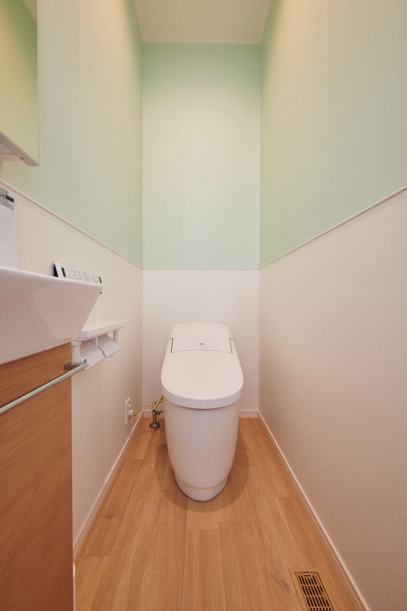 トイレはミントグリーンとホワイトのクロスを貼り分け。爽やかで落ち着きのある空間に。