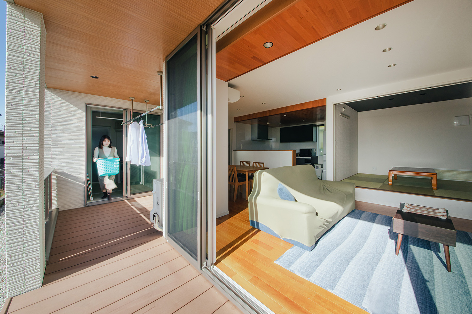 ウッドデッキはリビングから、室内干しスペースから