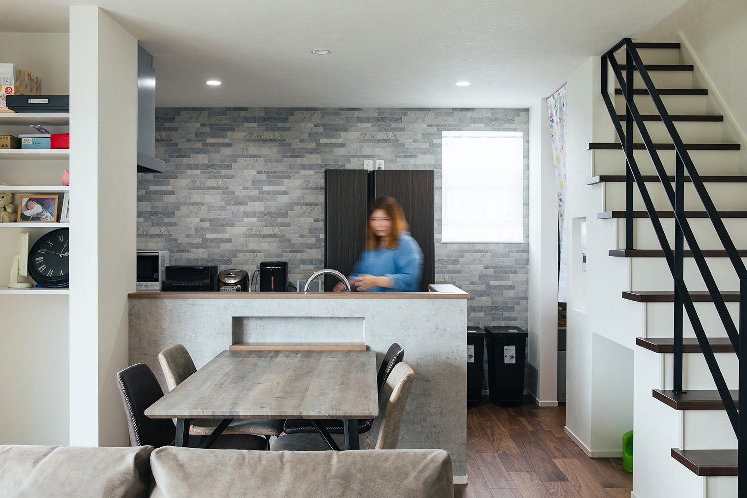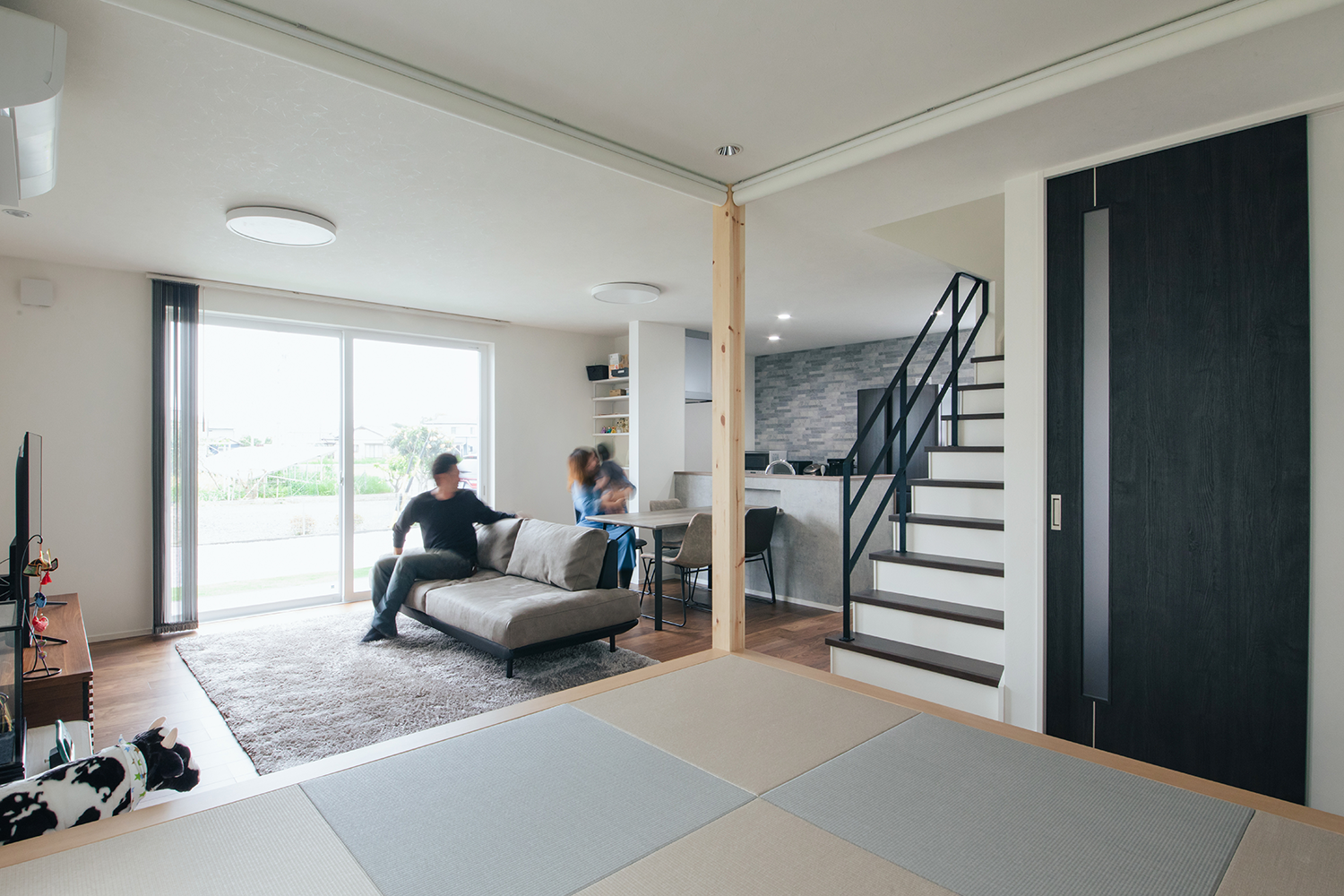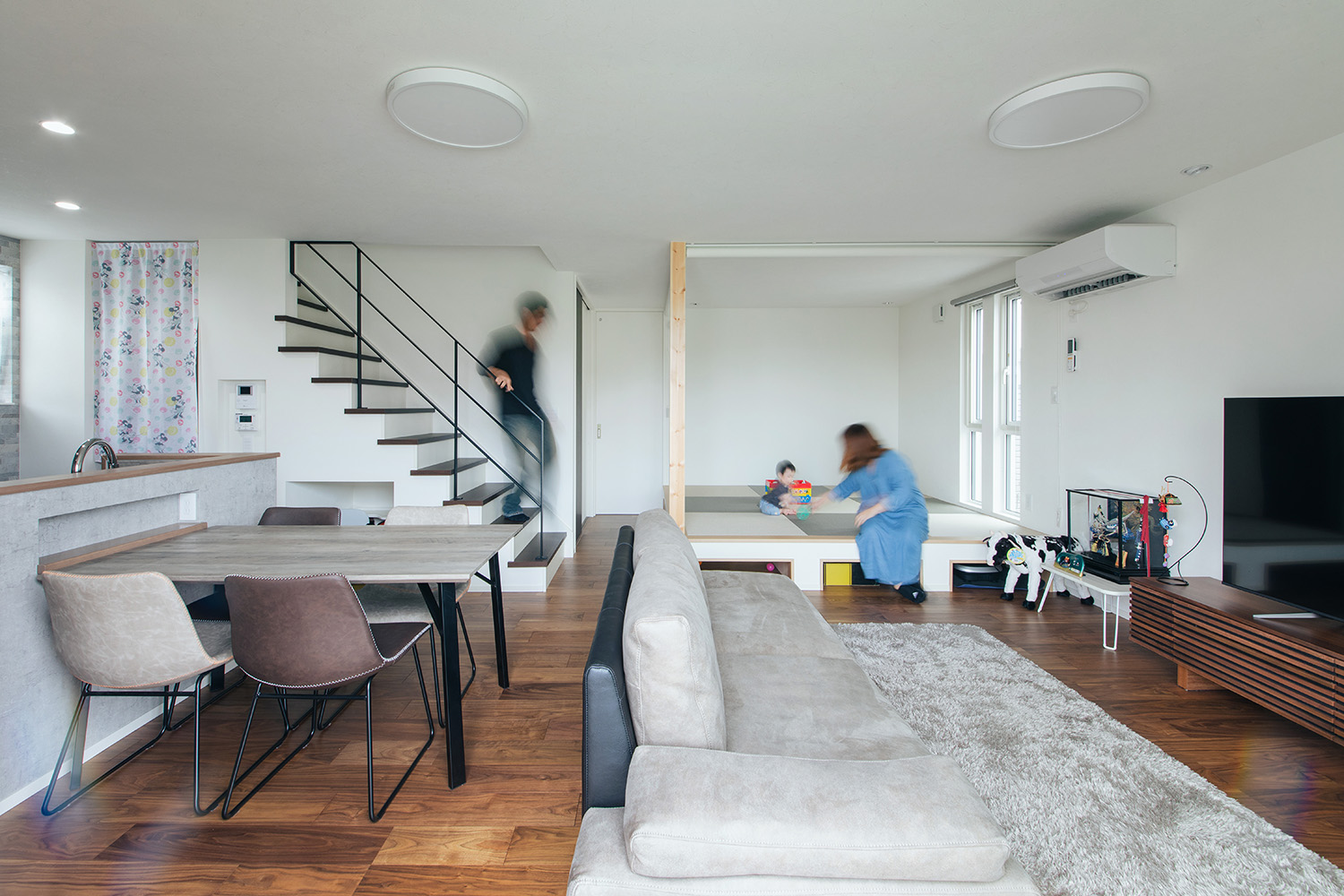小上がりから眺めたLDKの様子です。造作のアイアン手すりがアクセントになっています。