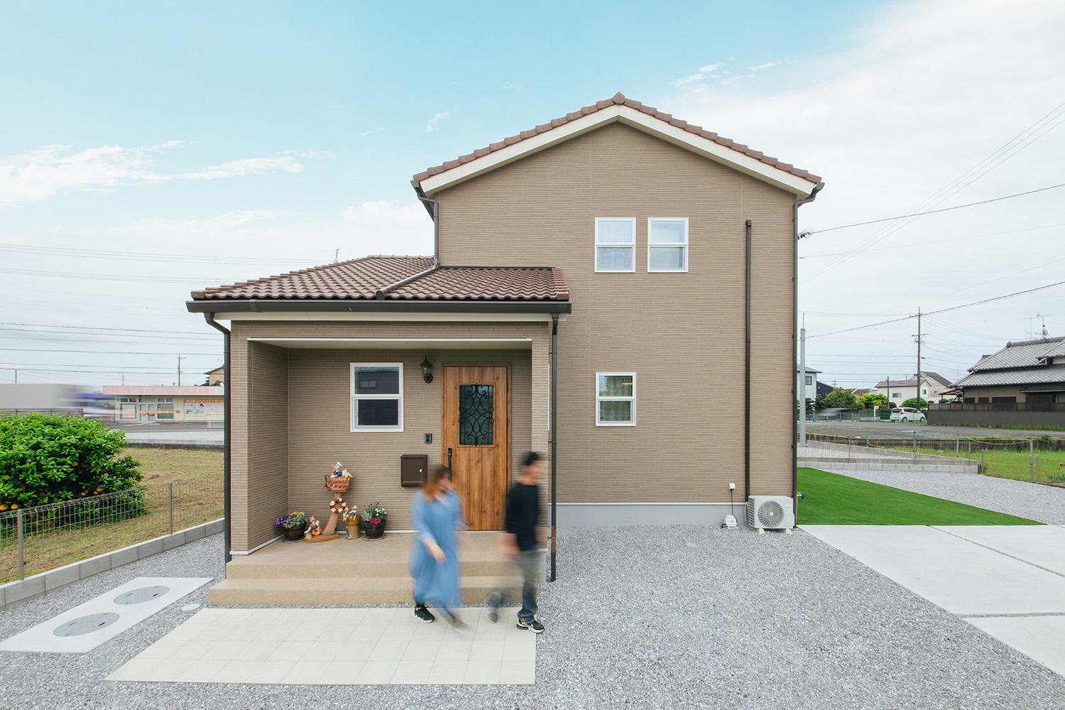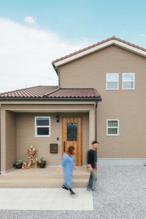 西洋瓦を採用した南欧風の外観。玄関ポーチを広くとり、鉢植えをおしゃれにならべてカフェのような雰囲気に。