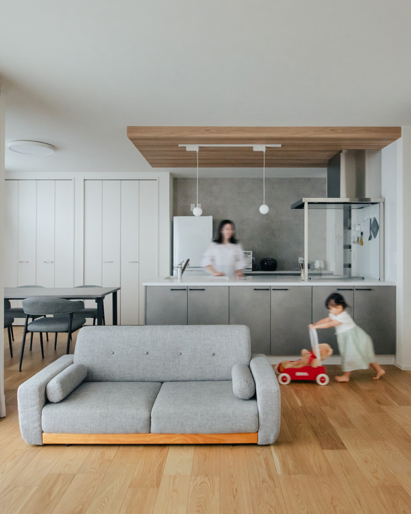 キッチン上部を折り下げ天井にすることで空間にメリハリをプラス♪