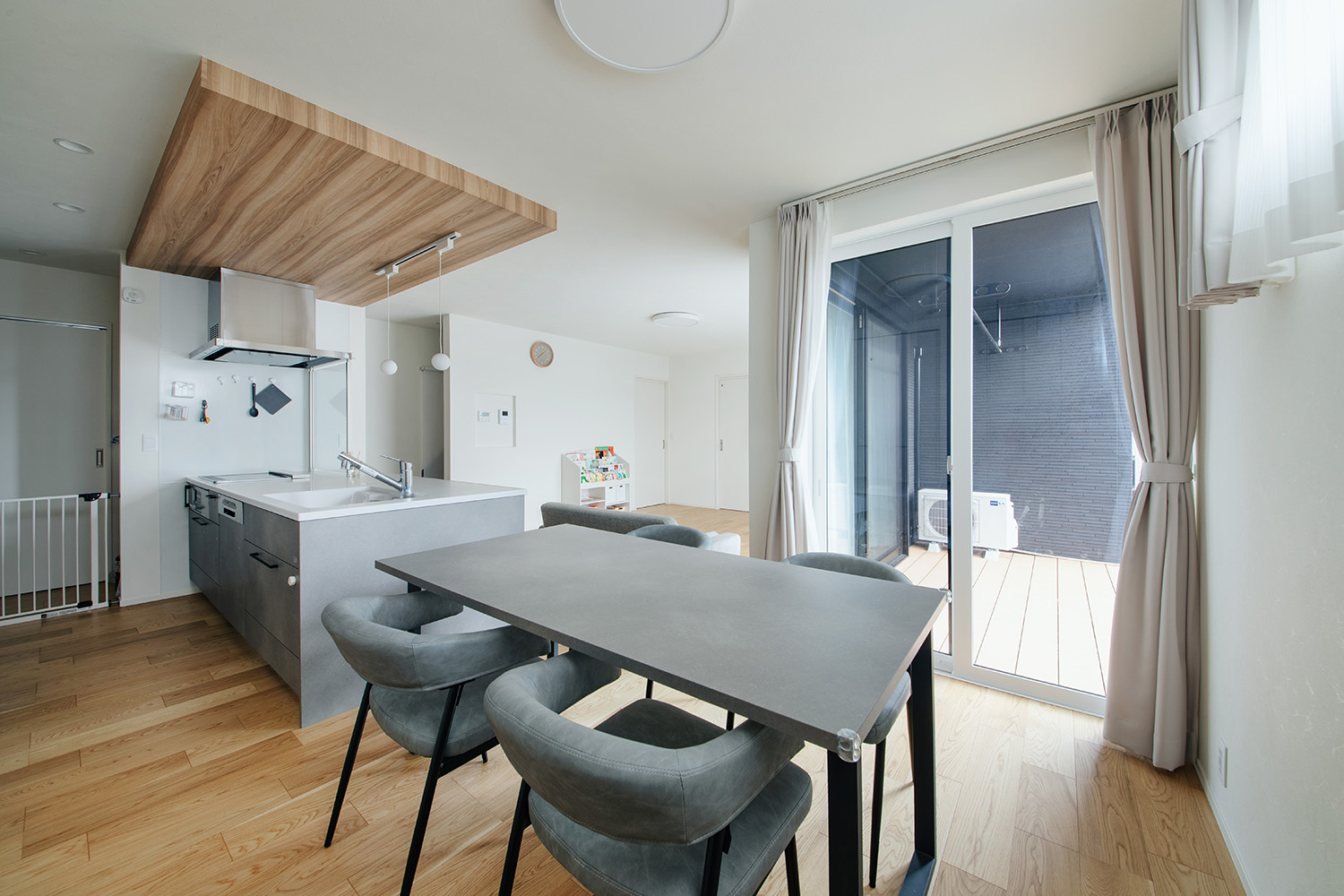 キッチンと横並びのダイニングで、配膳もらくらく。目の前の掃出し窓から目線が広がり