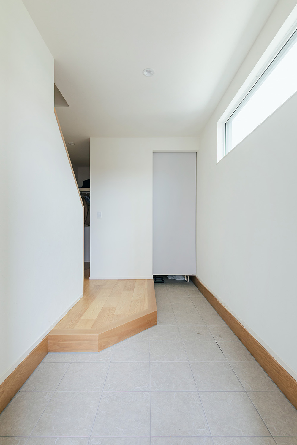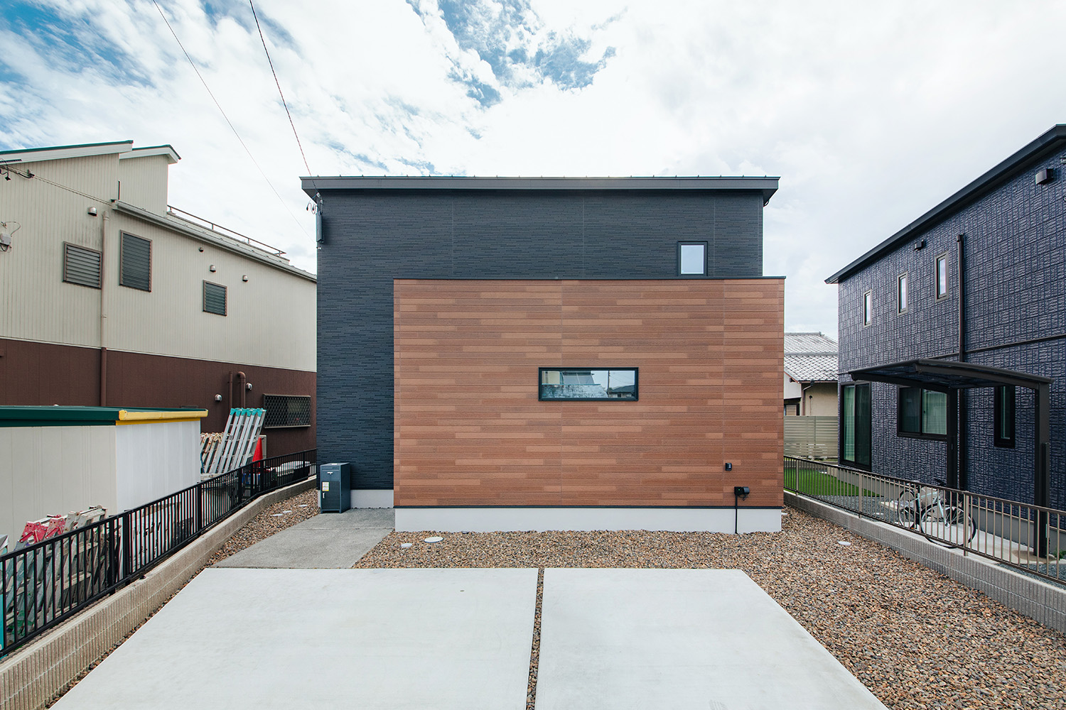 プライバシー確保を一番に重視した外観です。子供への安全面も考え、玄関を道路側から見えない位置に設けました。ポーチには奥行を持たせてあるのがポイントです。