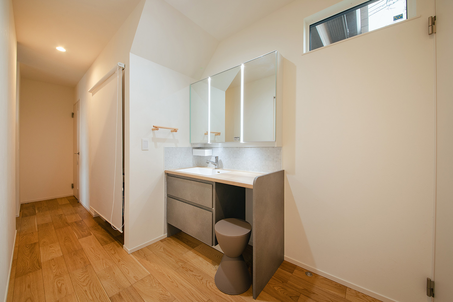 玄関からもすぐにアクセス出来て、いつでも使いやすいオープンな洗面化粧台。