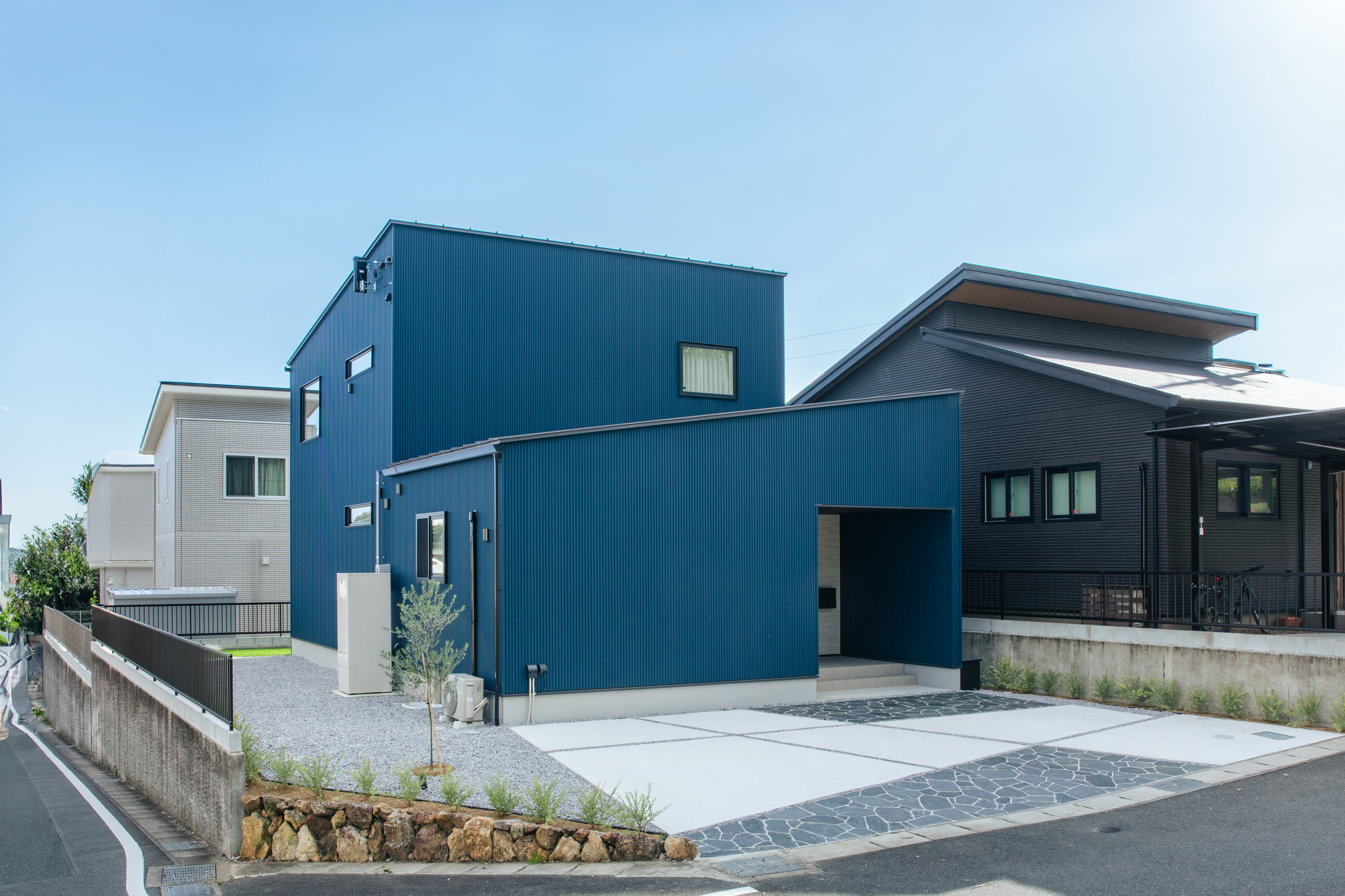 ブルーのガルバリウム鋼板を外壁に採用したボックス型の住宅です。クールな色合いと直線的なデザインを組み合わせ、都会的で洗練された印象を与える外観に仕上げました。