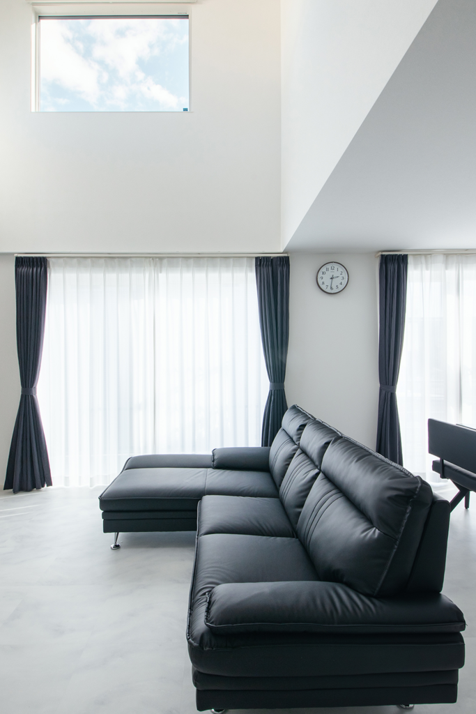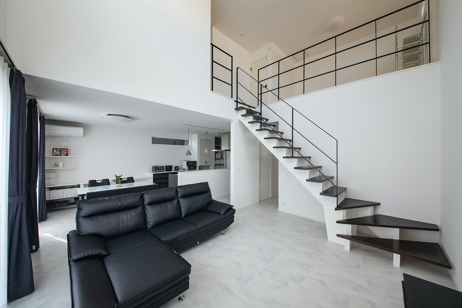 リビングの床には、グレーのフロアタイルを採用。ブラックとホワイトを絶妙に配したデザインは、空間にリズムを生み、単調さを感じさせません。吹き抜けから降り注ぐ自然光が明るく広がりのある印象を演出します。