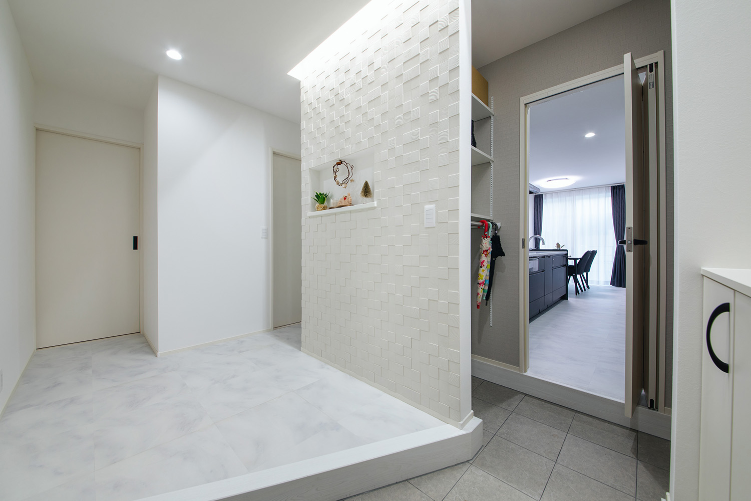 玄関から直接キッチンへ入れる、日々の買い物後の荷物運びや家事動線を大幅に効率化できる間取りです。