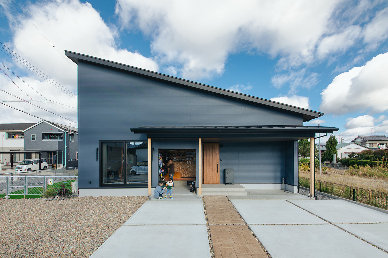 片流れ屋根のスタイリッシュなデザインが、シンプルながらも洗練された外観を演出。外壁には耐久性とメンテナンス性に優れたガルバリウム鋼板を採用し、シャープな印象を与えつつ、素材感が住まい全体にモダンな雰囲気をプラスしています。さらに、屋根の形状を活かし、雨水がスムーズに流れるよう設計されているため、見た目だけでなく機能面でも優れています。