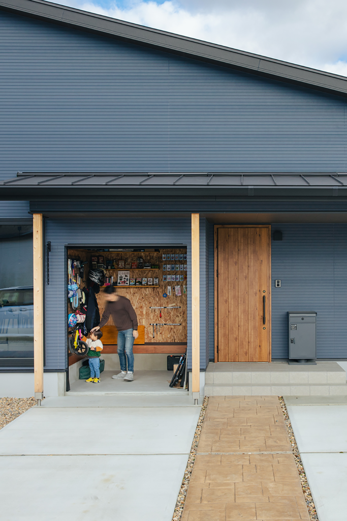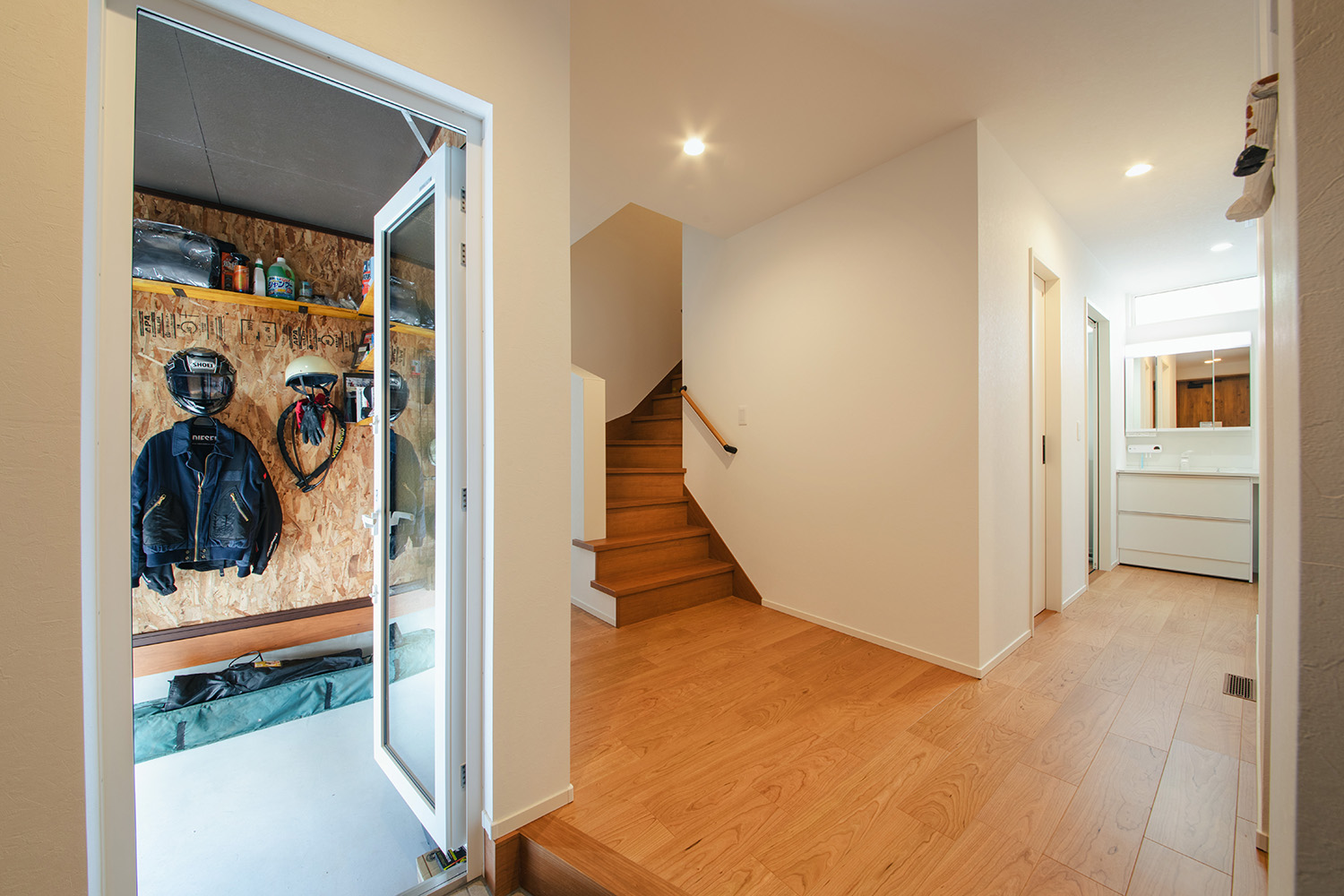 玄関から直接アクセスできるガレージは、お施主様の趣味を存分に楽しめる空間として設計しました。アウトドア用品の収納スペースとして活用できるほか、大切なバイクを保管する場所としても最適です。