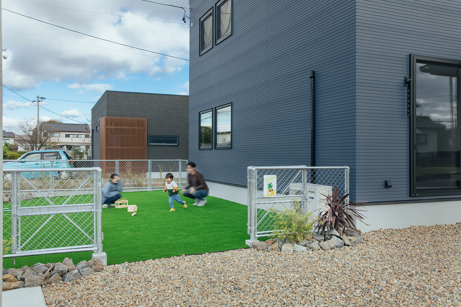 お庭は、家族や友人と一緒に遊べる開放的なスペースとして設計しました。