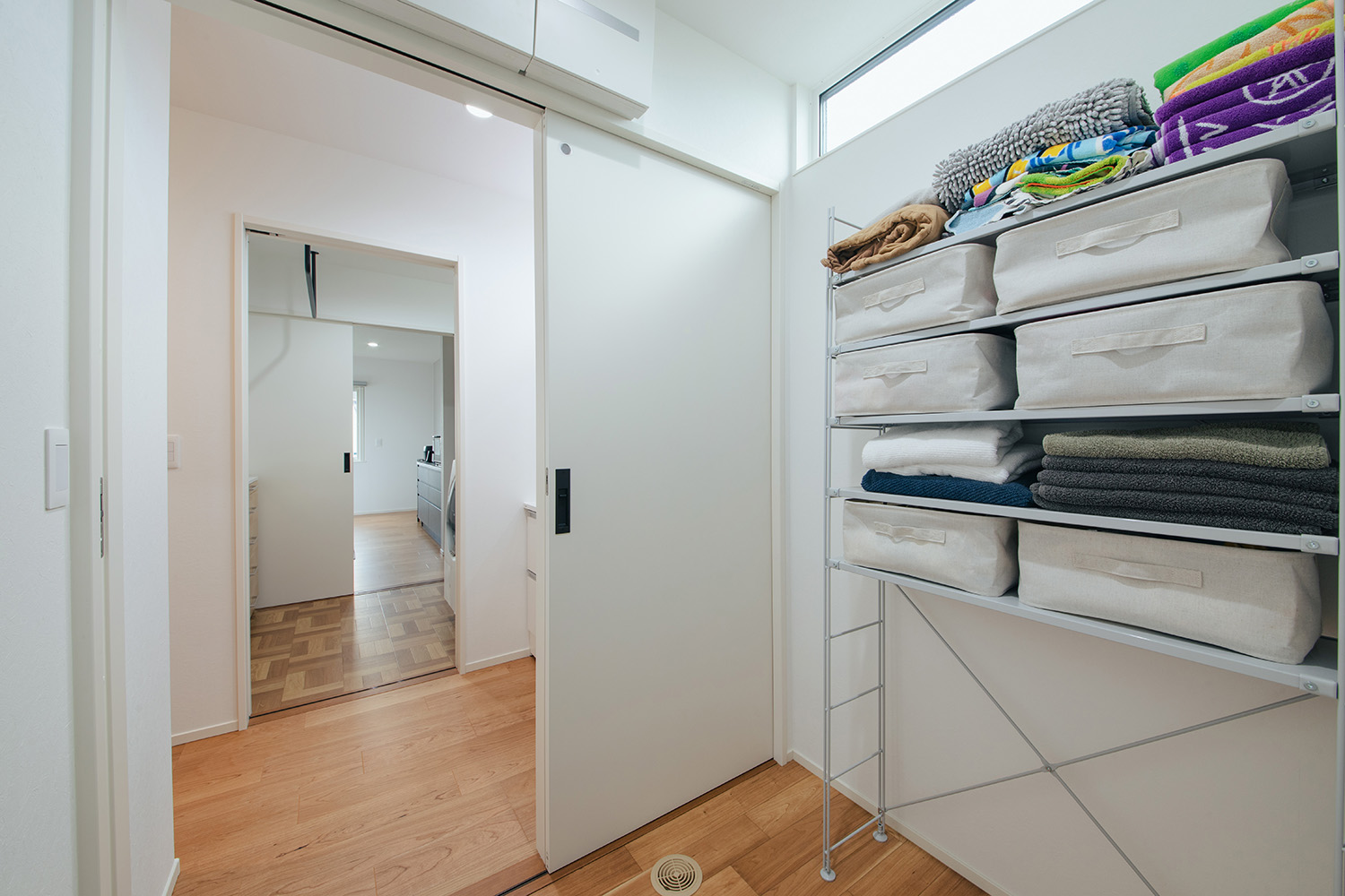 キッチンからはパントリー、洗面室、脱衣室、そしてお風呂場へとつながるスムーズな家事動線を確保。忙しい日々の中でも効率的に家事をこなせるよう設計されています。また、パントリーは収納力に優れており、買い置きした食品や調理器具などをすっきりと整理できます。