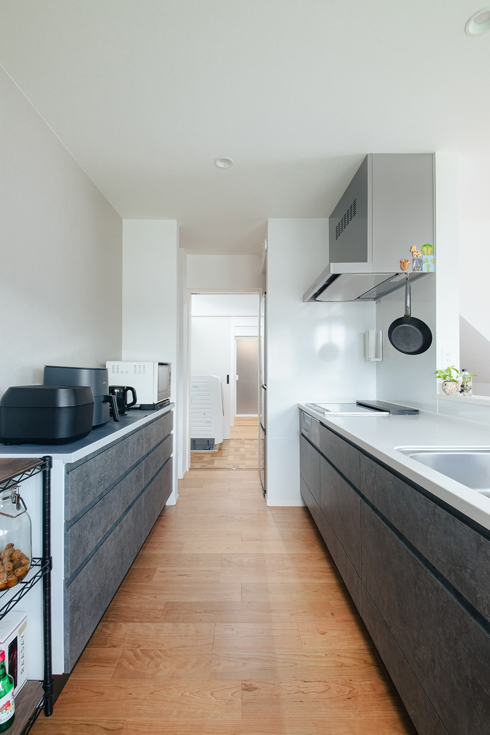 キッチンはグレーを基調としたモダンで洗練されたデザインに。シンプルな中にも高級感を感じられるカラーリングが特徴です。周囲の木目を活かしたナチュラルなインテリアと見事に調和し、空間全体を引き締めるアクセントとして機能しています。