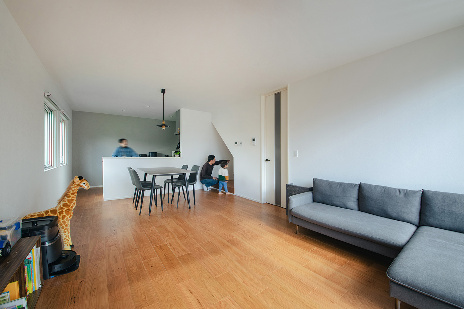 リビングはナチュラルテイストを基調に、木の温もりを感じられる空間に仕上げました。広々としたリビングの一角には、家族が本を読んだりくつろいだりできるヌックを設置。窓から差し込む柔らかな自然光と調和し、居心地の良さが際立つ場所となっています。