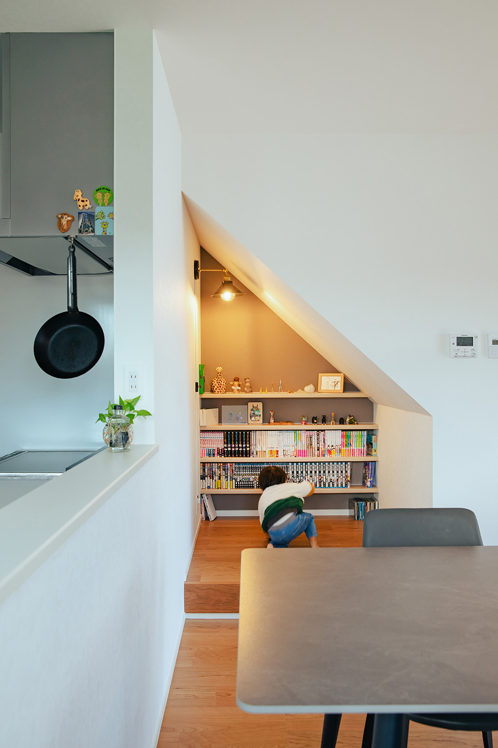 ヌックにはお気に入りの漫画を並べた本棚とクッションを配置し、大人も子どももリラックスして過ごせる空間に仕上げています。ちょっとした息抜きや読書タイムにぴったりのこのスペースは、リビング全体のアクセントにもなっています。