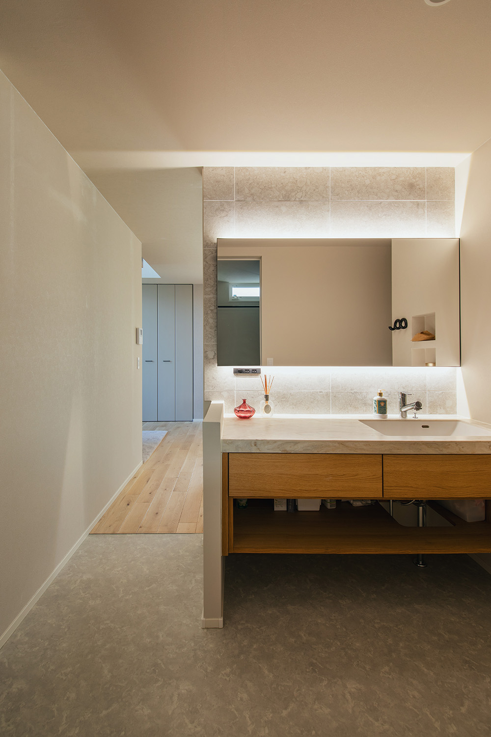 洗面スペースとランドリー、ウォークスルークローゼット、主寝室を回遊できる動線を設けたことで