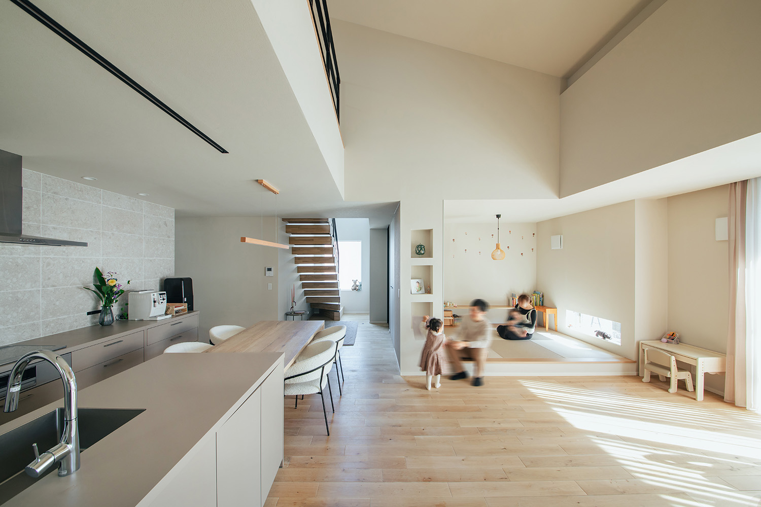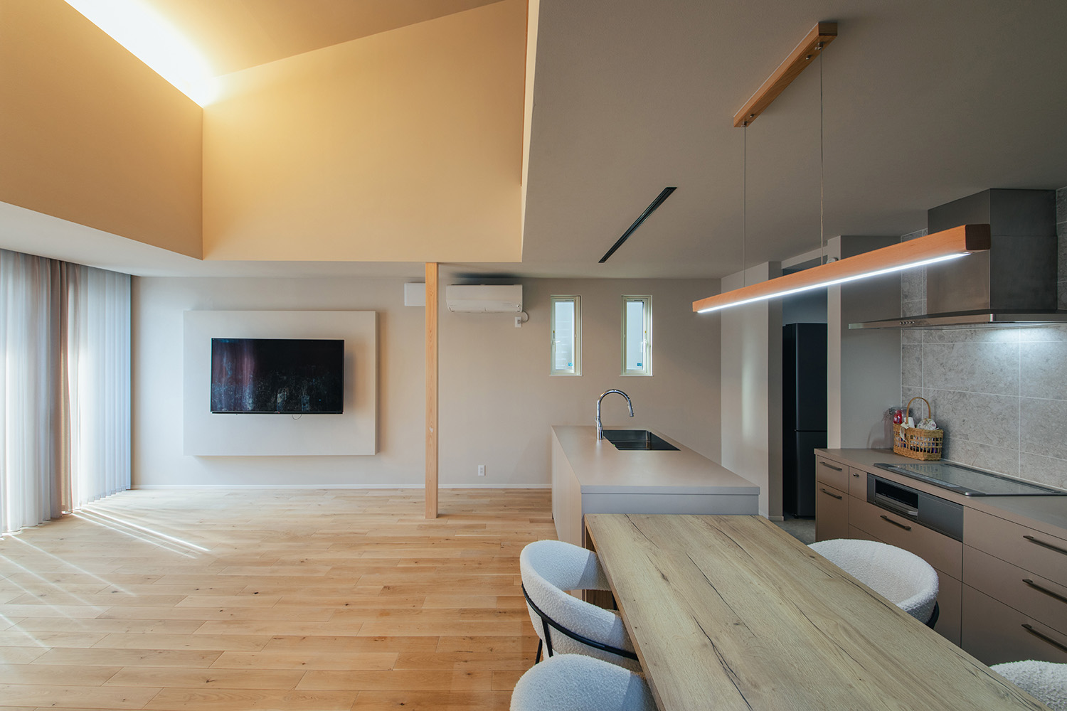 吹き抜けと勾配天井で開放的な27.5帖の広々としたLDK