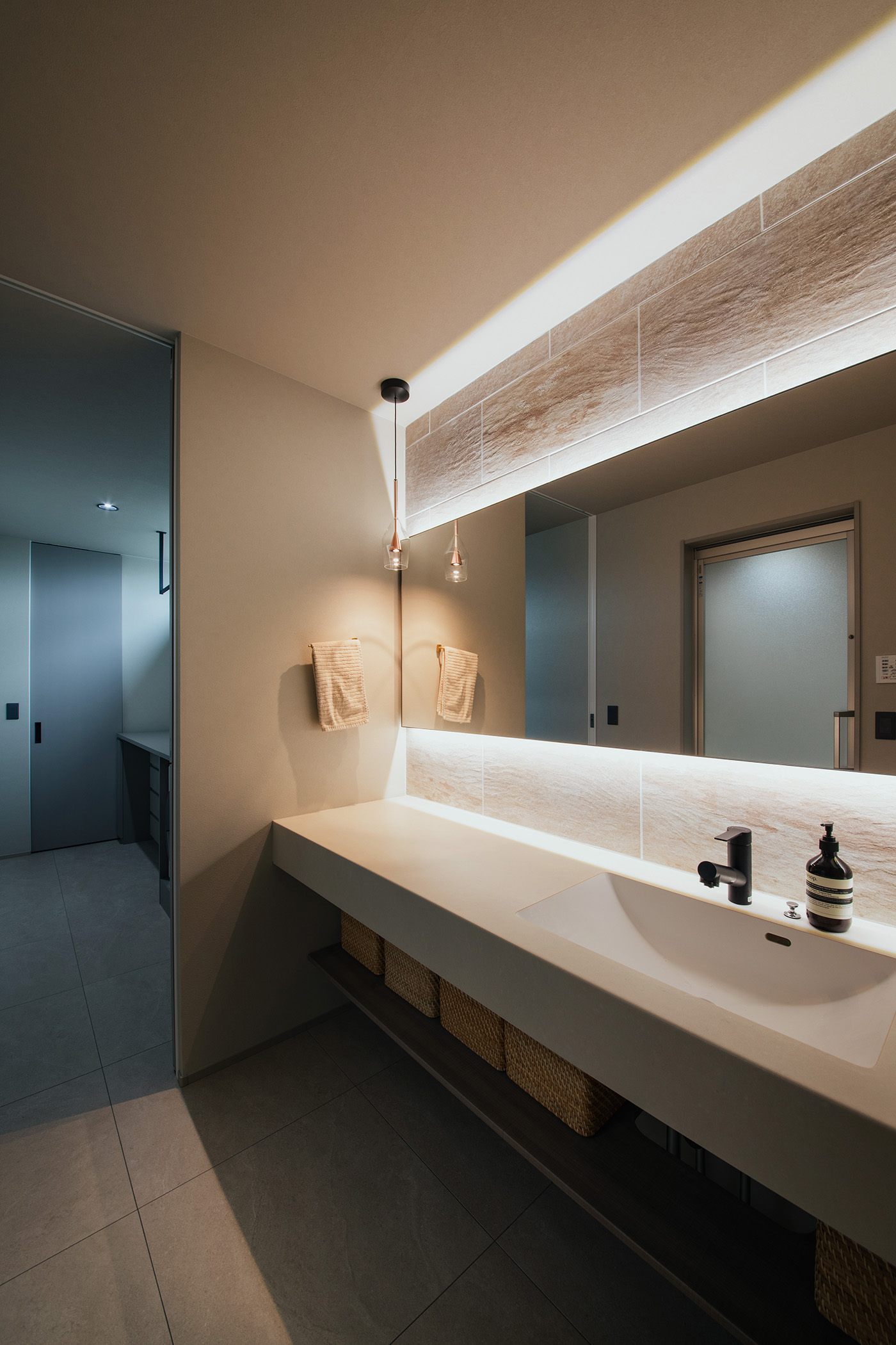 洗面化粧台の壁面にはタイルを貼ることで上質なアクセントと非日常感を演出し、毎日の身支度を心地よく彩ります。