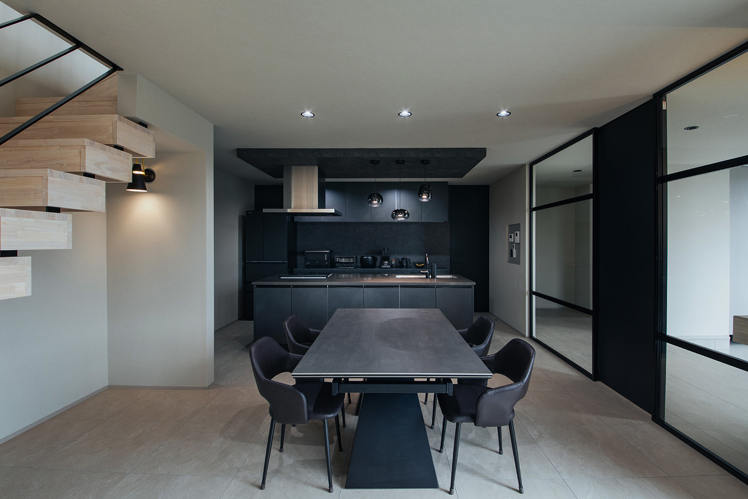 一方、キッチン・ダイニングスペースはブラックをメインに取り入れることで、空間にメリハリを持たせ、洗練された印象に仕上げました。