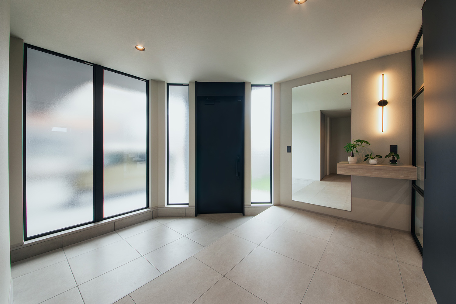 床から天井までの大きなFIX窓を玄関横に配置し、玄関空間と一体感を持たせることで、より開放的な印象に。
