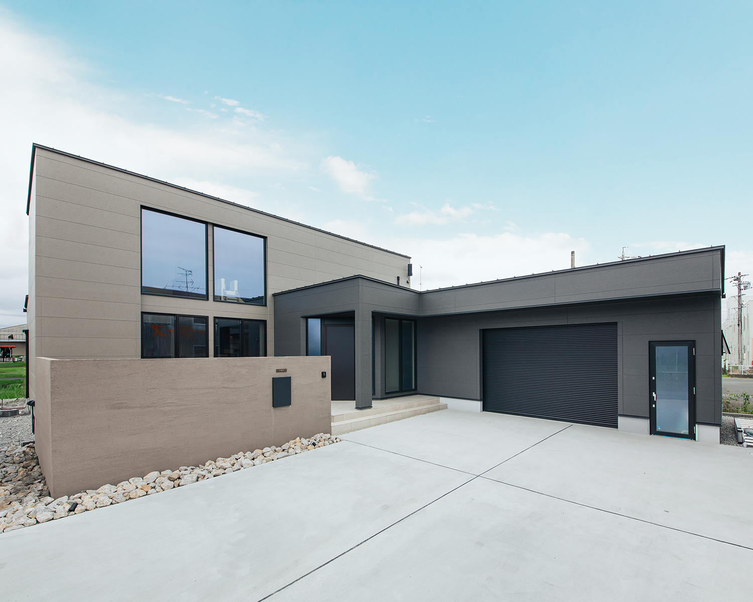 ガレージ部分と外壁の仕上げを貼り分けることで、シンプルなフォルムにメリハリが生まれ、より洗練された印象に仕上がっています。