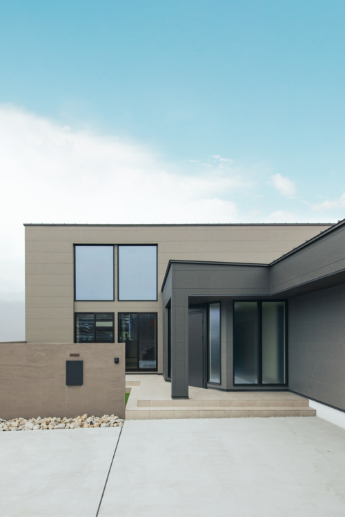 南側に設けた大きな窓を一か所にまとめることで、すっきりとした印象の中に重厚感を演出した外観デザイン。