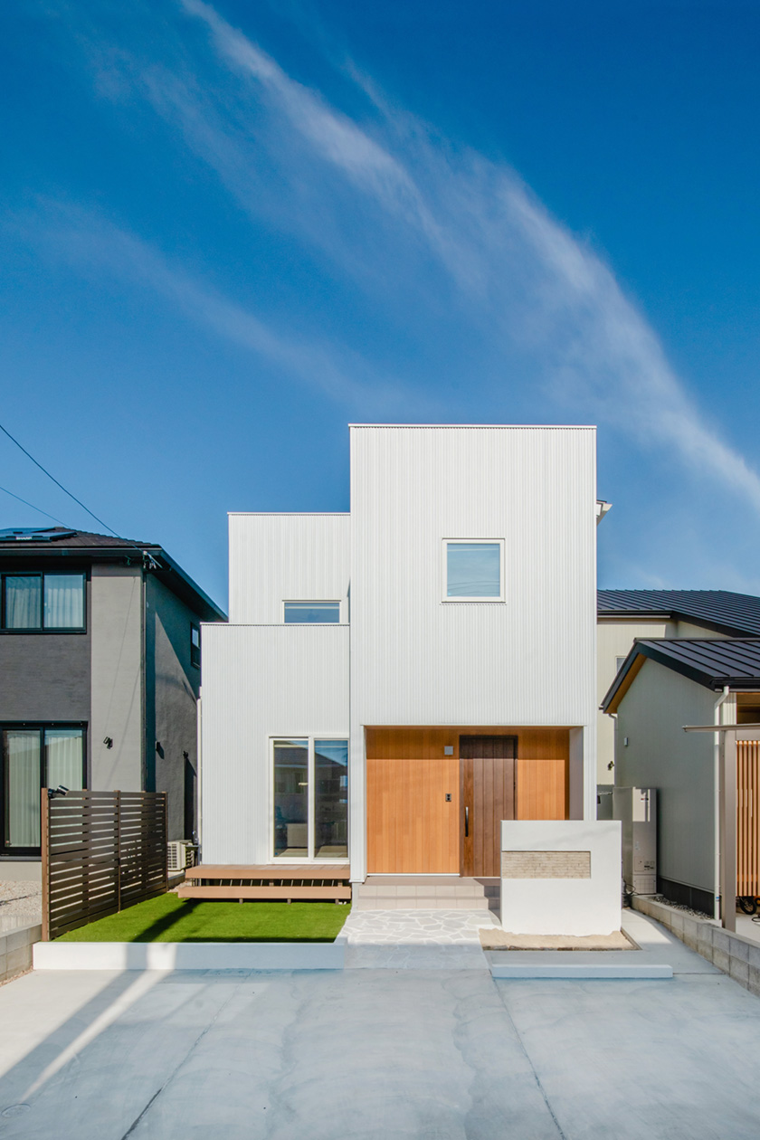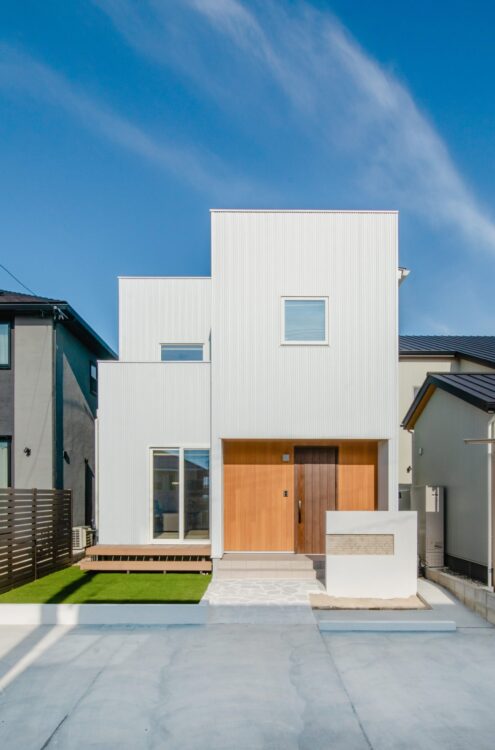 爽やかな白のガルバリウム鋼板に木目調がよく合います。