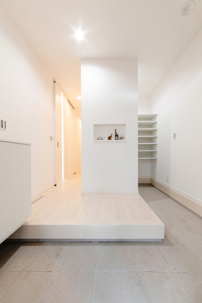 玄関は土間をL字型に設け、シューズクロークを確保。