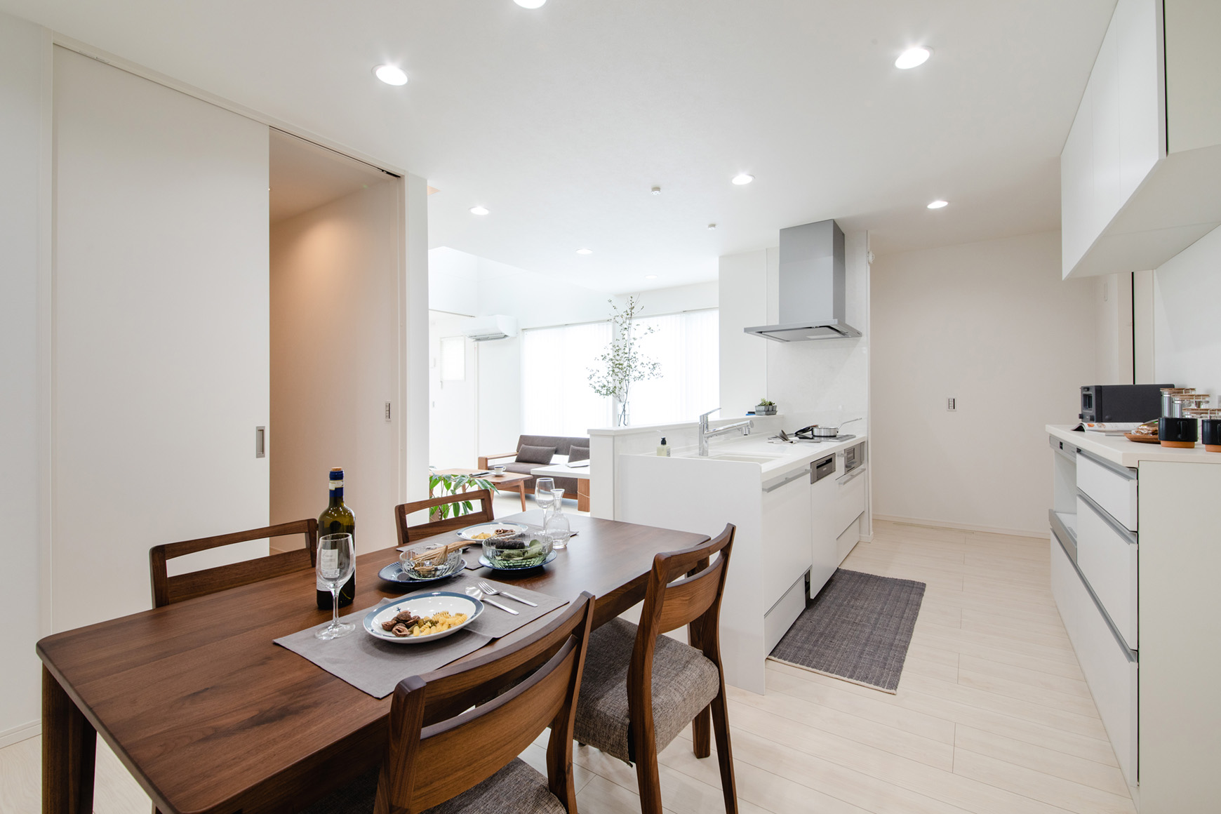 キッチンとダイニングテーブルを横並びに配置し、配膳や片付けが便利に。