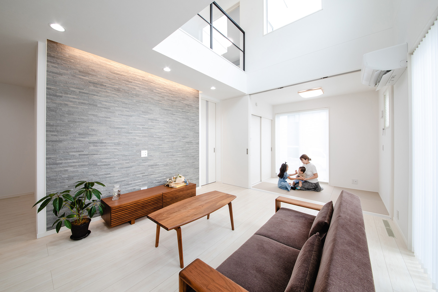 吹き抜けのリビング。白を基調とした明るく清々しい空間が家族の団らんのステージ。