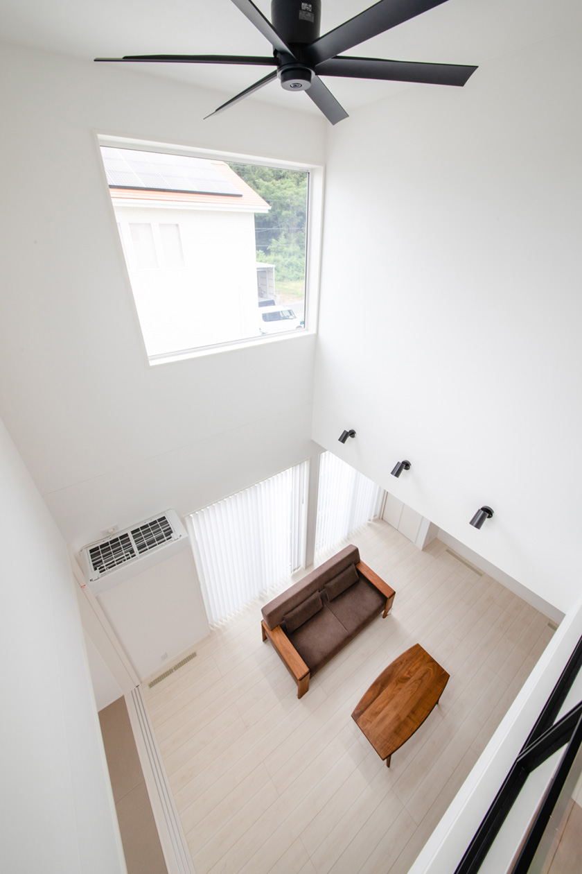 2階から眺めたリビング。吹き抜けの高窓が室内全体に明るさをもたらし、開放感でいっぱい。