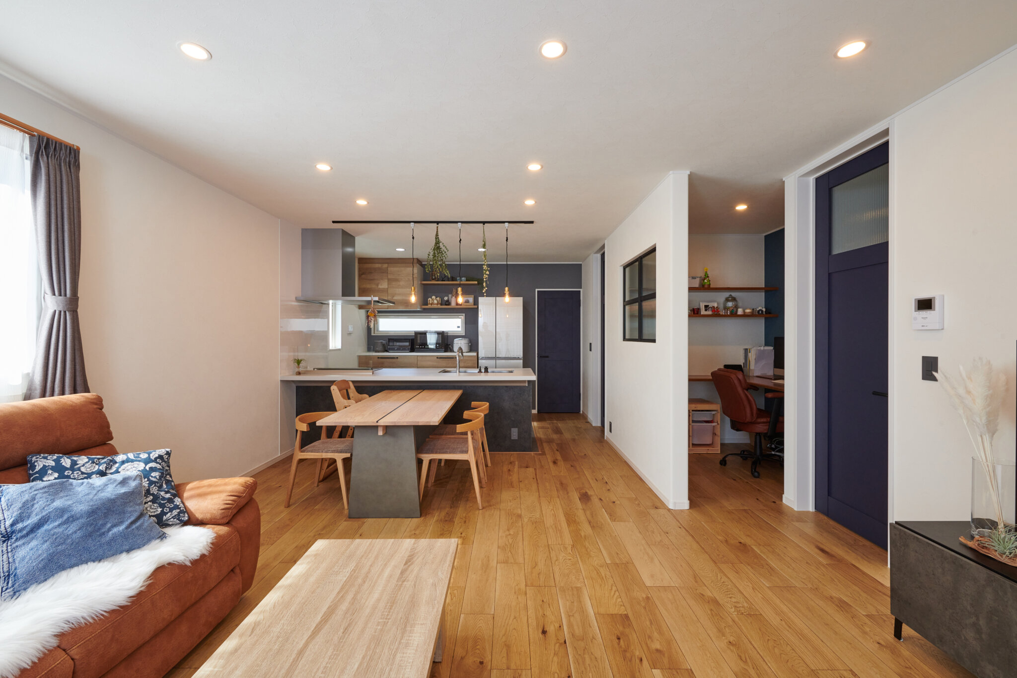 ダイニング背後のワークスペースは家族の気配を感じられるようにデコマドを取付、扉を設置しないオープンなつくりに。