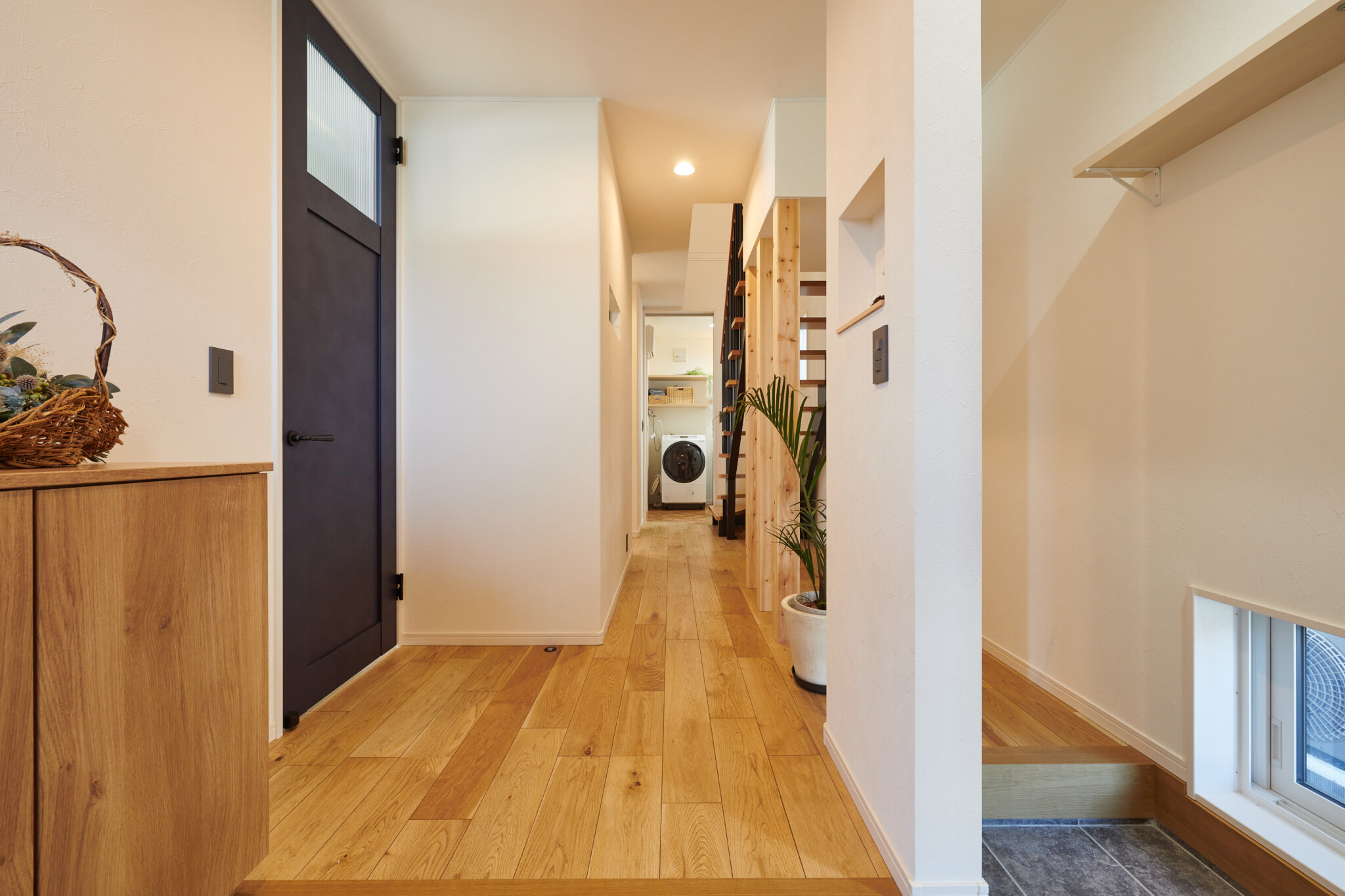 玄関からホールに上がり、まっすぐ進むと洗面・脱衣室へ。