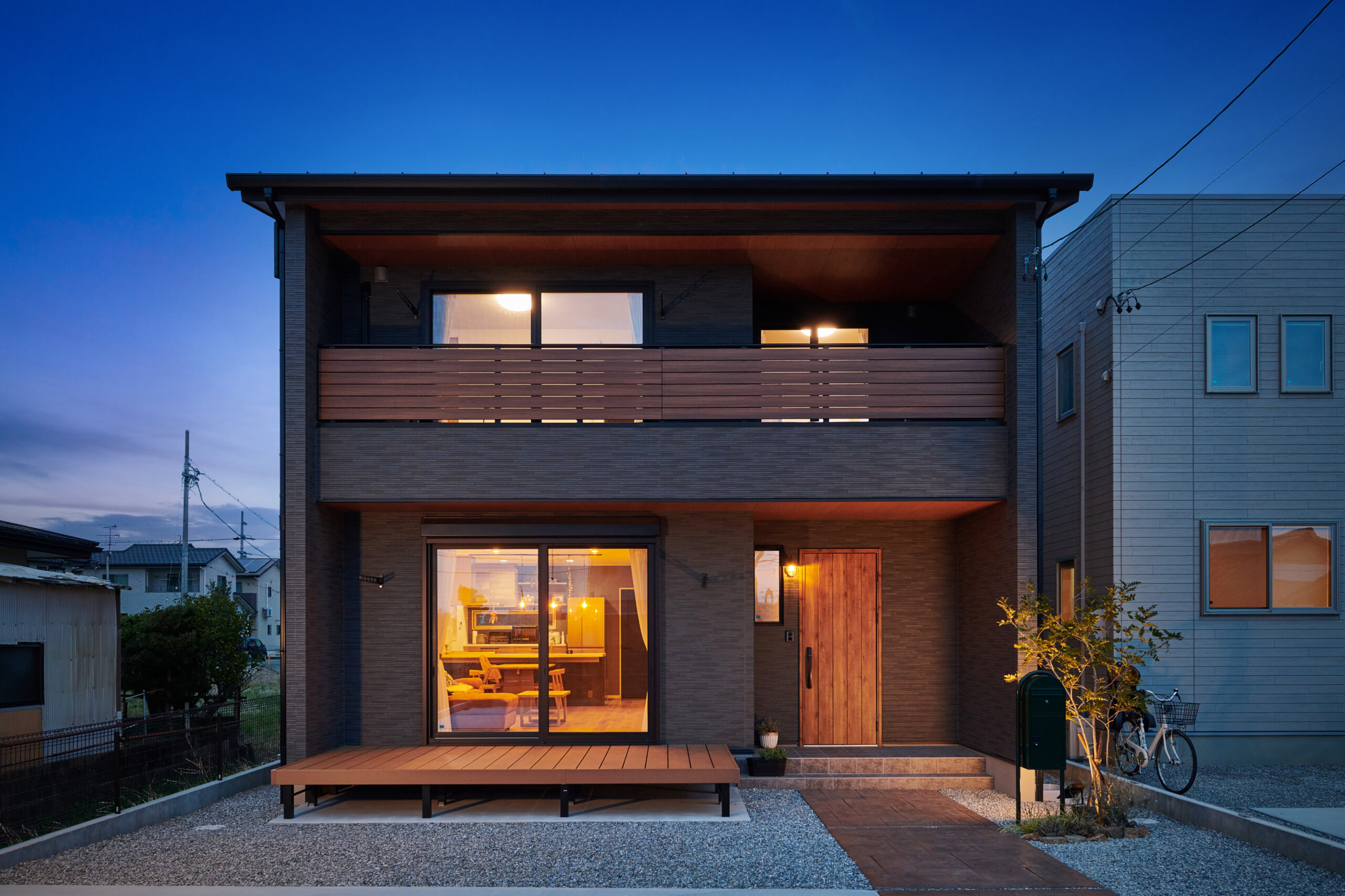 「木をみせたい」というご要望に合わせて軒天に木を貼り、玄関ドアとインナーバルコニー前の格子も木目がアクセントになるものを選んでいます。