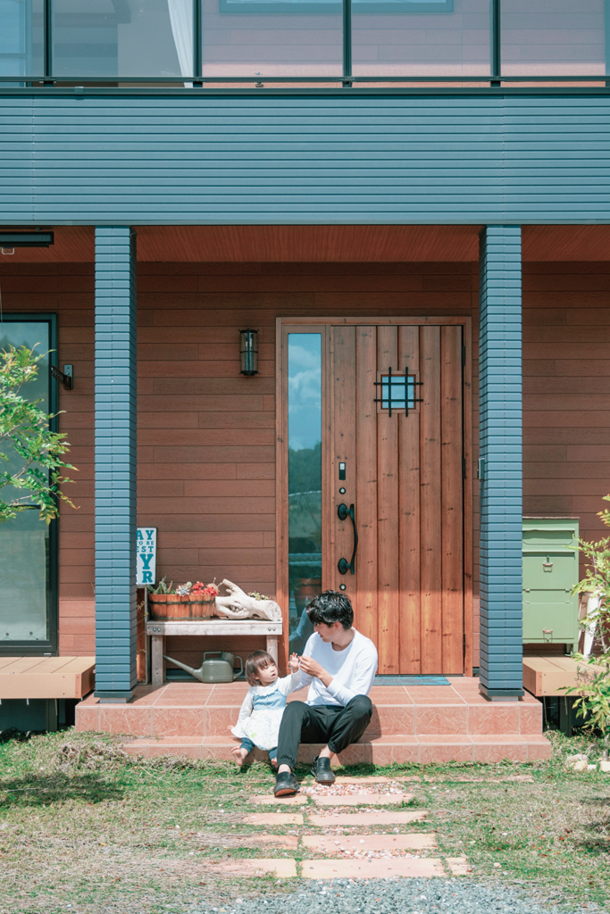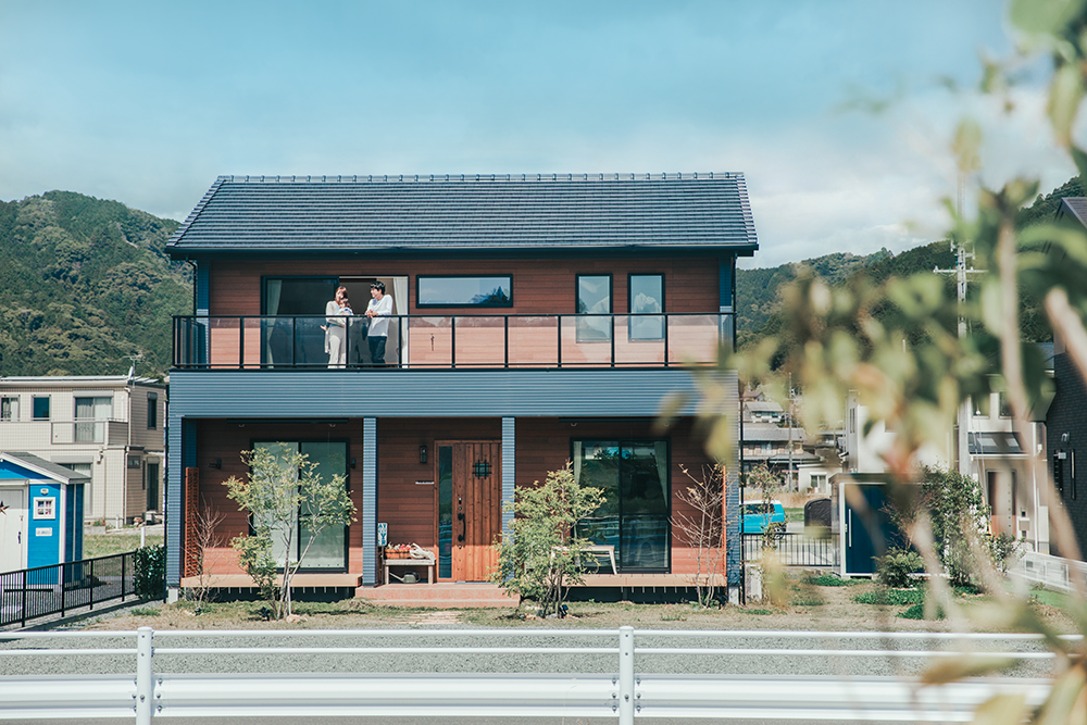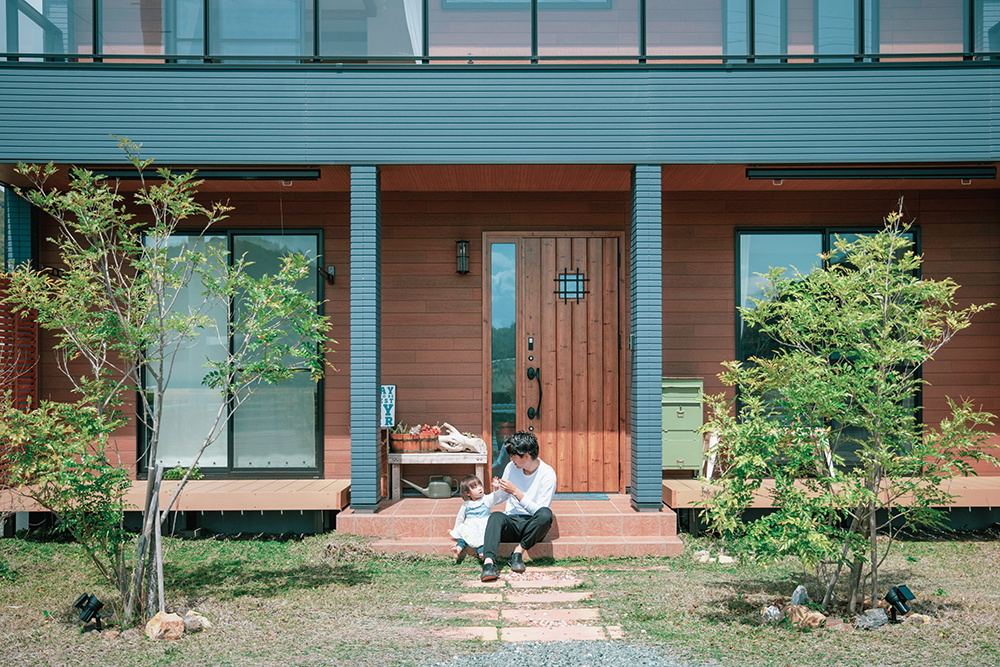木目を基調に濃いグレーを組み合わせた外観。自然のなかでのびのび暮らしたいというご夫婦の願いをかなえる、自然と調和したデザインです。