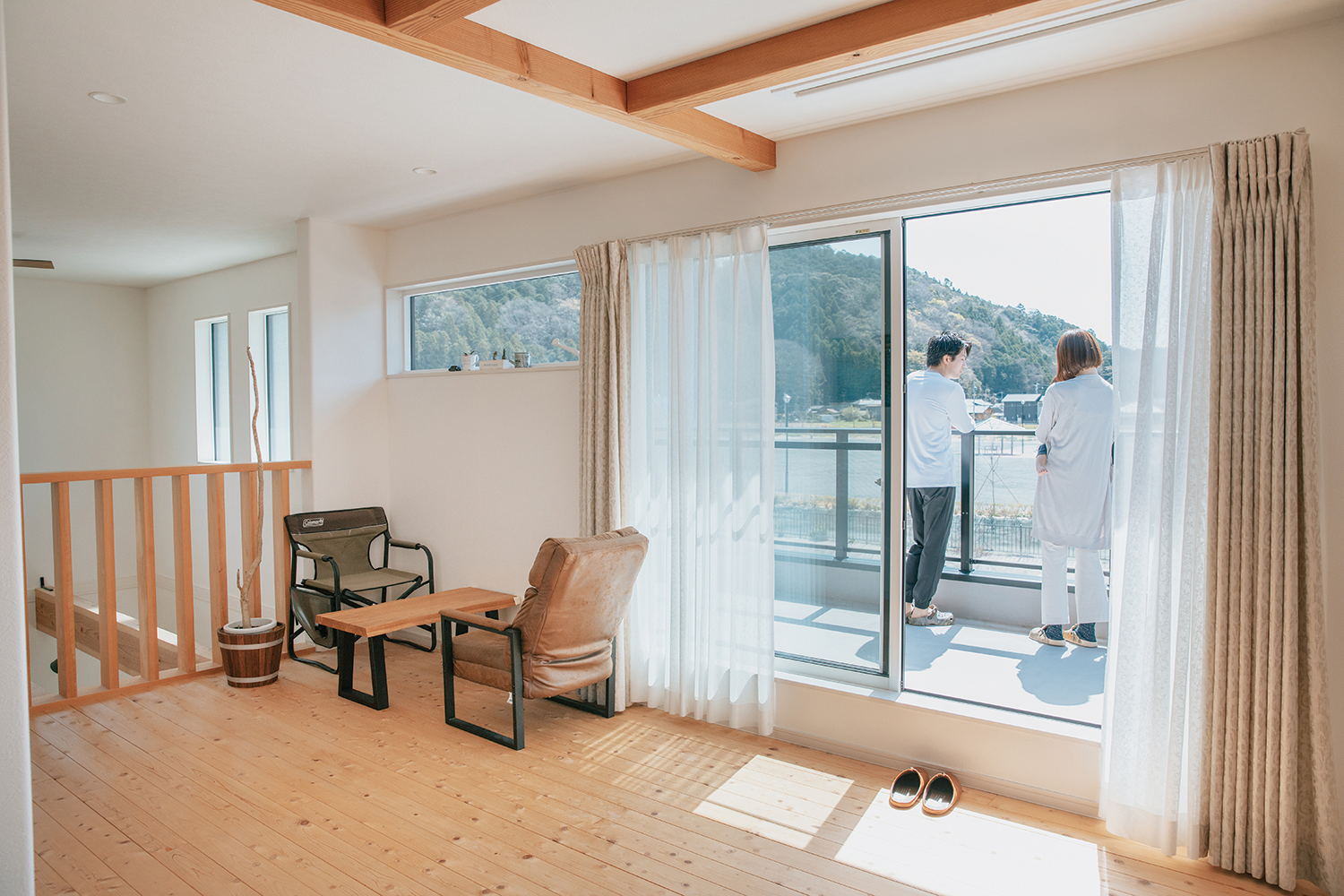 リビングの吹抜けに面したフリースペースはセカンドリビングとして利用。ベランダから見える山々を眺めながらくつろぐことができます。