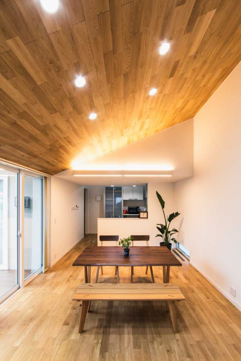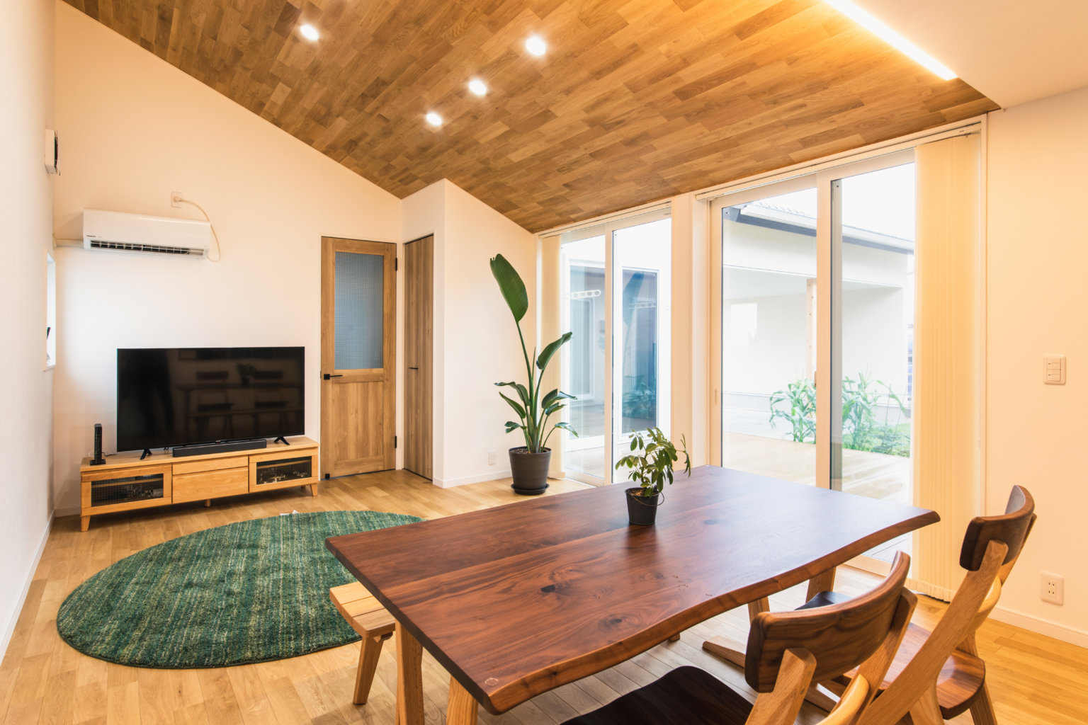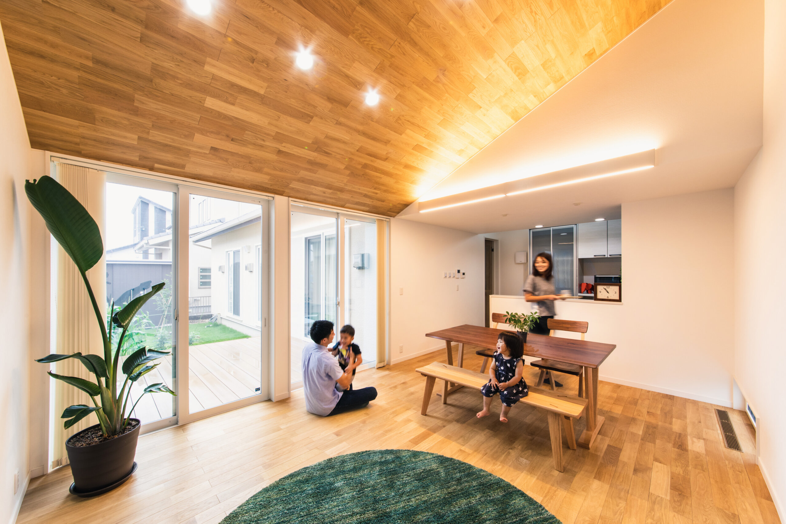ウッドデッキにつながるLDKは勾配天井にすることでさらに開放感がある空間に。