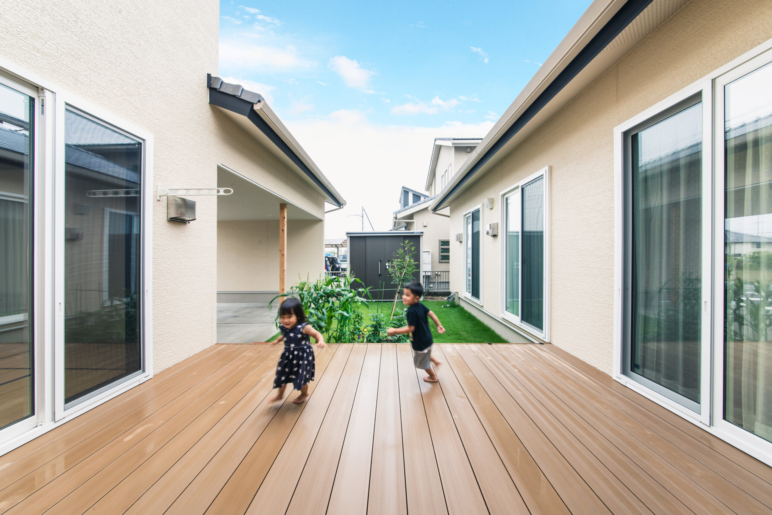のびのびお子さまが遊べます。もちろん各部屋からお子様の様子も分かるので離れていてもお家の様子が分かるのも、コの字型の家の魅力です。