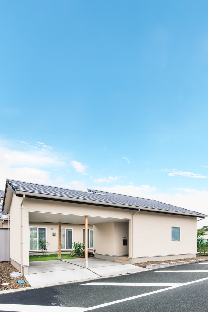 外部は車2台が雨に濡れないよう屋根を設置玄関でぬれることなく移動できる動線なので、雨の日も安心です。ガレージがあることによって、外からの視線の目隠しにもなりプライベートを守ってくれる効果もあります。
