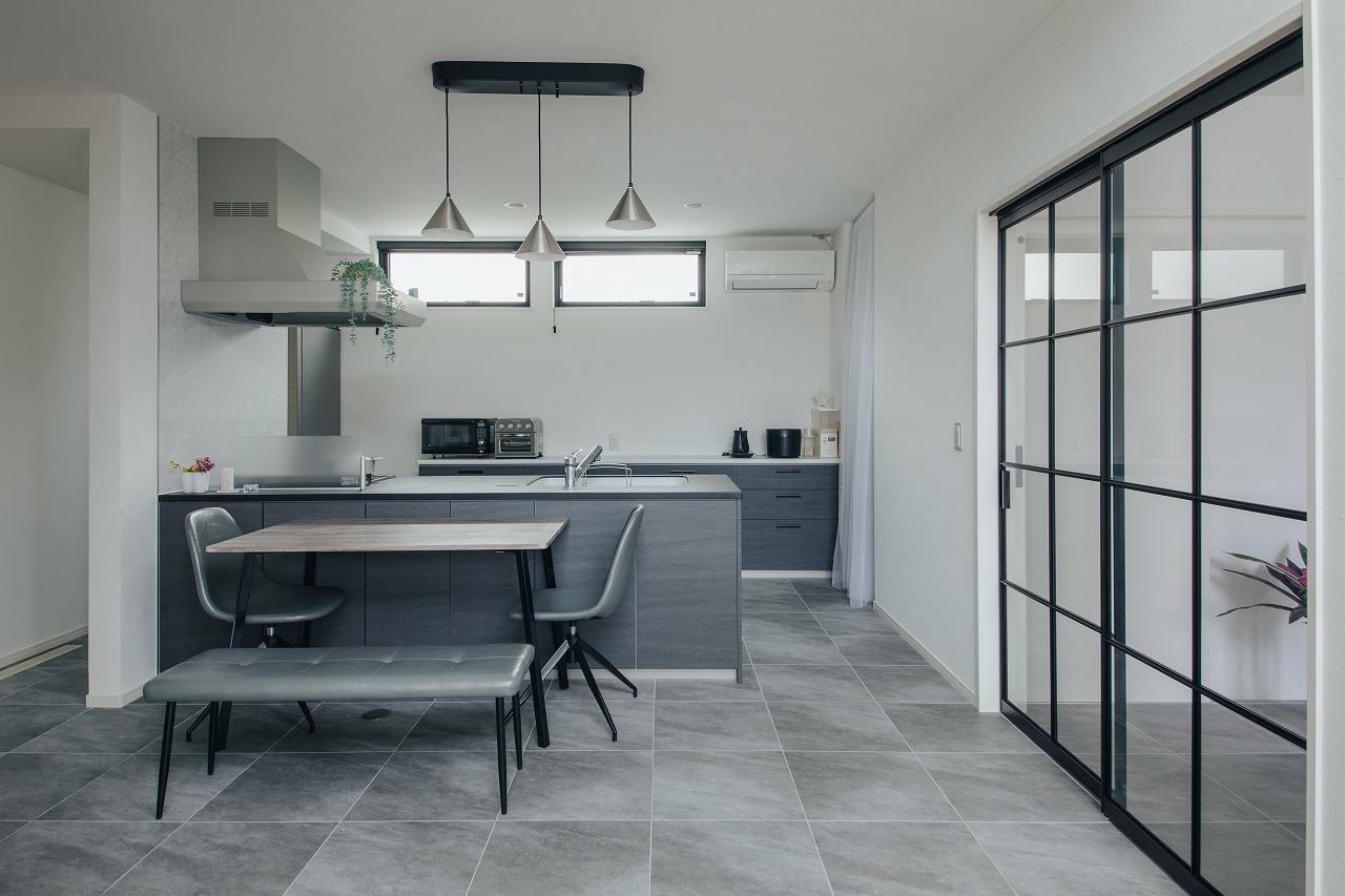 グレーでまとめたスタイリッシュなダイニング・キッチンです。キッチン上部に収納は設けず窓をつけることで開放的で明るい空間に。ラウンド式なので家事がしやすく奥様も大満足です